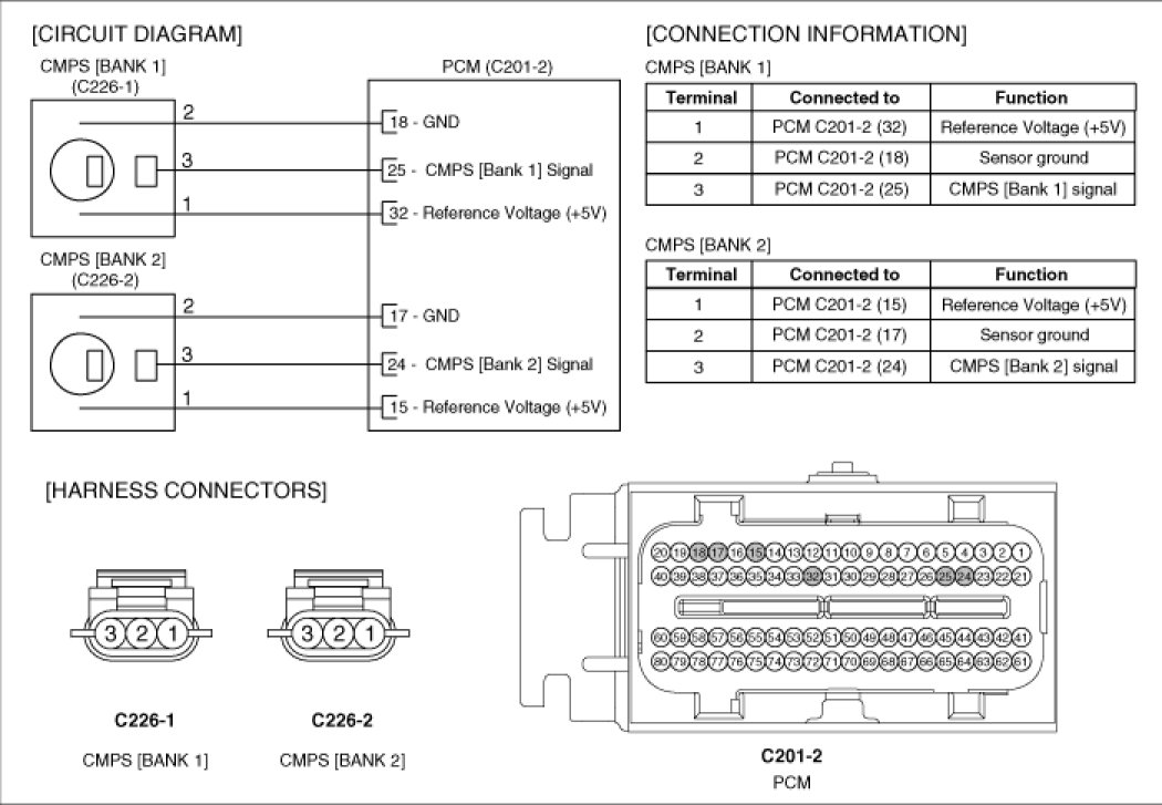 Camshaft Position Sensor (CMPS) is a hall sensor and detects the camshaft position by using a hall element. It is related with Crankshaft Position Sensor (CKPS) and detects the piston position of each cylinder which the CKPS can't detect. The two CMPS are installed on engine head cover of bank 1 and 2 and uses a target wheel installed on the camshaft. This sensor has a hall-effect IC which output voltage changes when magnetic field is made on the IC with current flow.