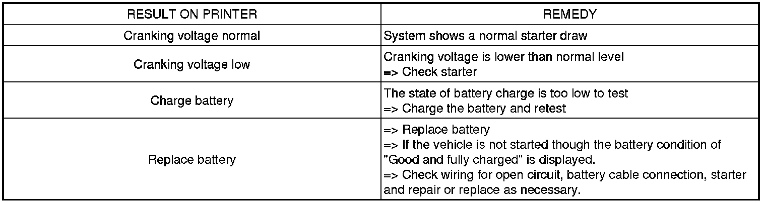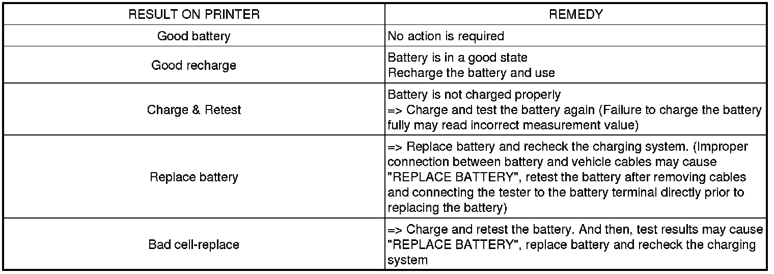 A relevant action must be given according to the test results by referring to the battery test results as shown in the table below.