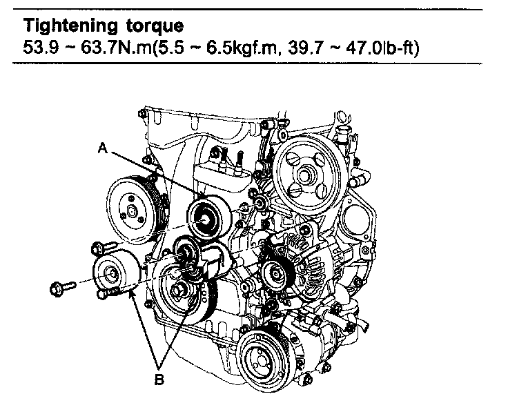 19. Install drive belt tensioner (B) and tensioner pulley.