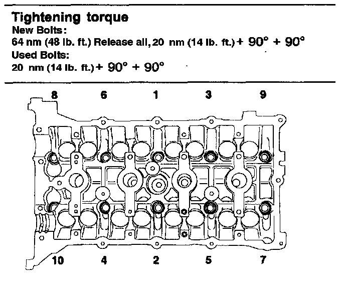 2) Using triple square hexagon wrench, install and tighten the 10 cylinder head bolts and plate washers, in several passes, in the sequence shown.
