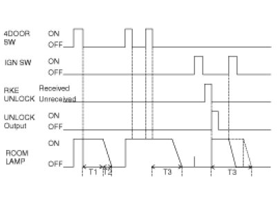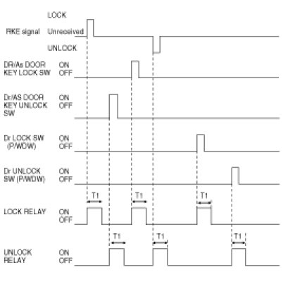 (2) Driver door unlock signal is output for T2 when RKE UNLOCK signal is received. But, all door unlock signals are output for T2 if RKE UNLOCK signal is received within T1.