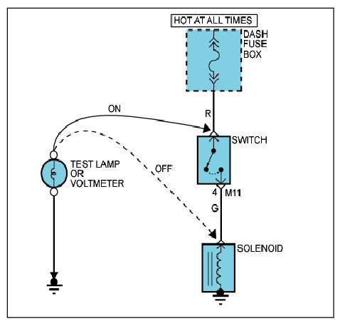 A. Connect one lead of a test lamp or voltmeter to a ground. If you are using a voltmeter, be sure it is the voltmeter's negative test lead you have connected to ground.