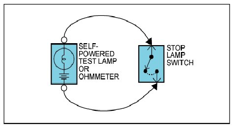B. Connect one lead of a self-powered test lamp or ohmmeter to one end of the part of the circuit you wish to lest. If you are using an ohmmeter, hold the leads together and adjust the ohmmeter to read zero ohms.