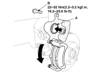 1. Remove guide rod bolt(B) and raise the caliper (A).Check the hoses and pin boots for damage and deterioration.