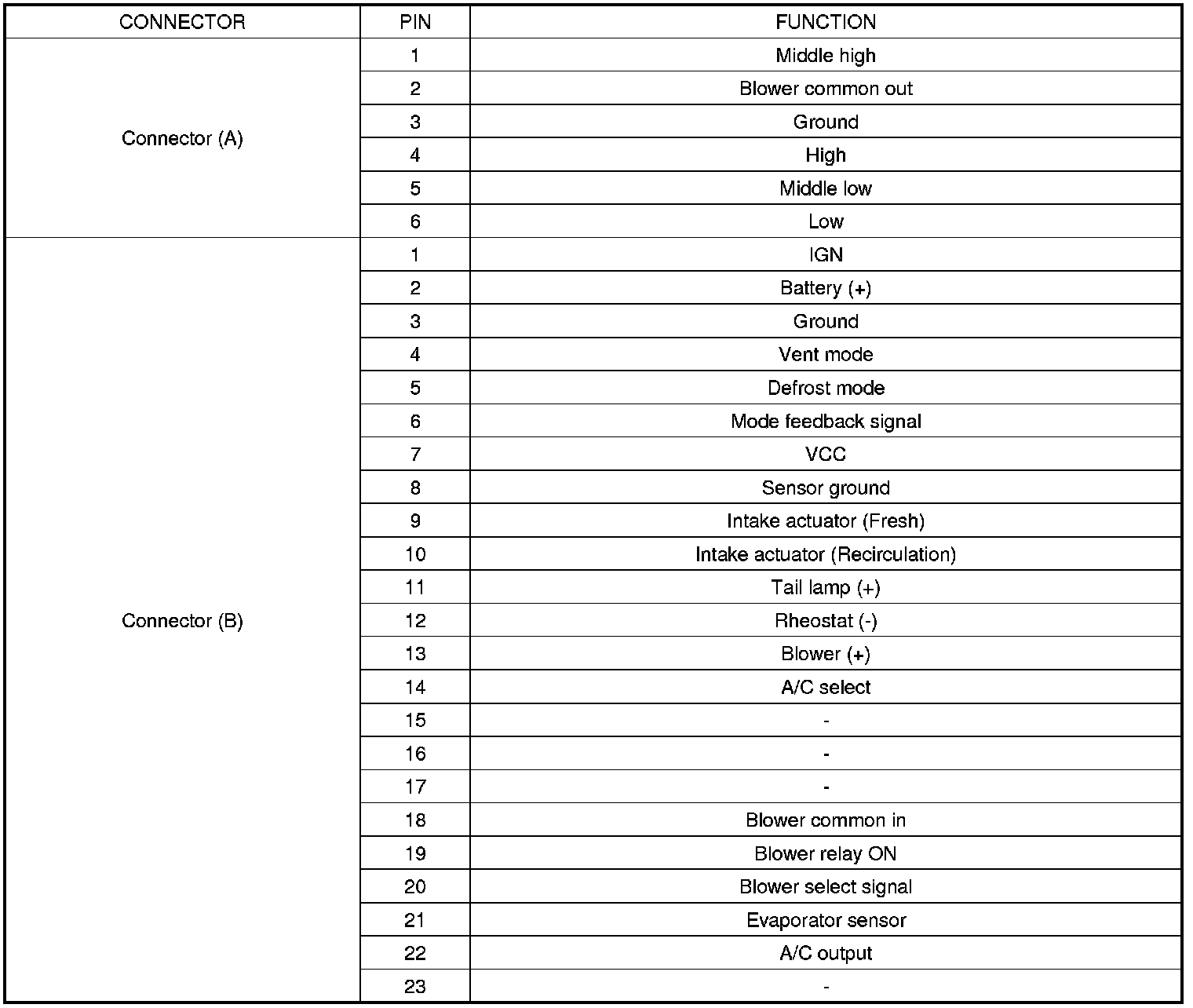CONNECTOR PIN FUNCTION