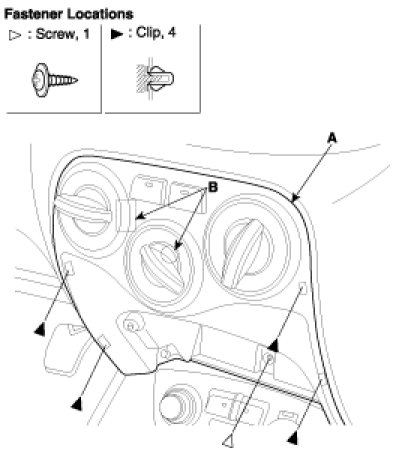 2. After loosen the center facia lower panel mounting screw, remove the center facia lower panel(A). Disconnect the heater control unit connector(B).