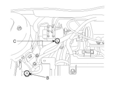 Recovery/Recycling/Charging System (A) to the high-pressure service port (B) and the low-pressure service port (C) as shown, following the equipment manufacturer's instructions.