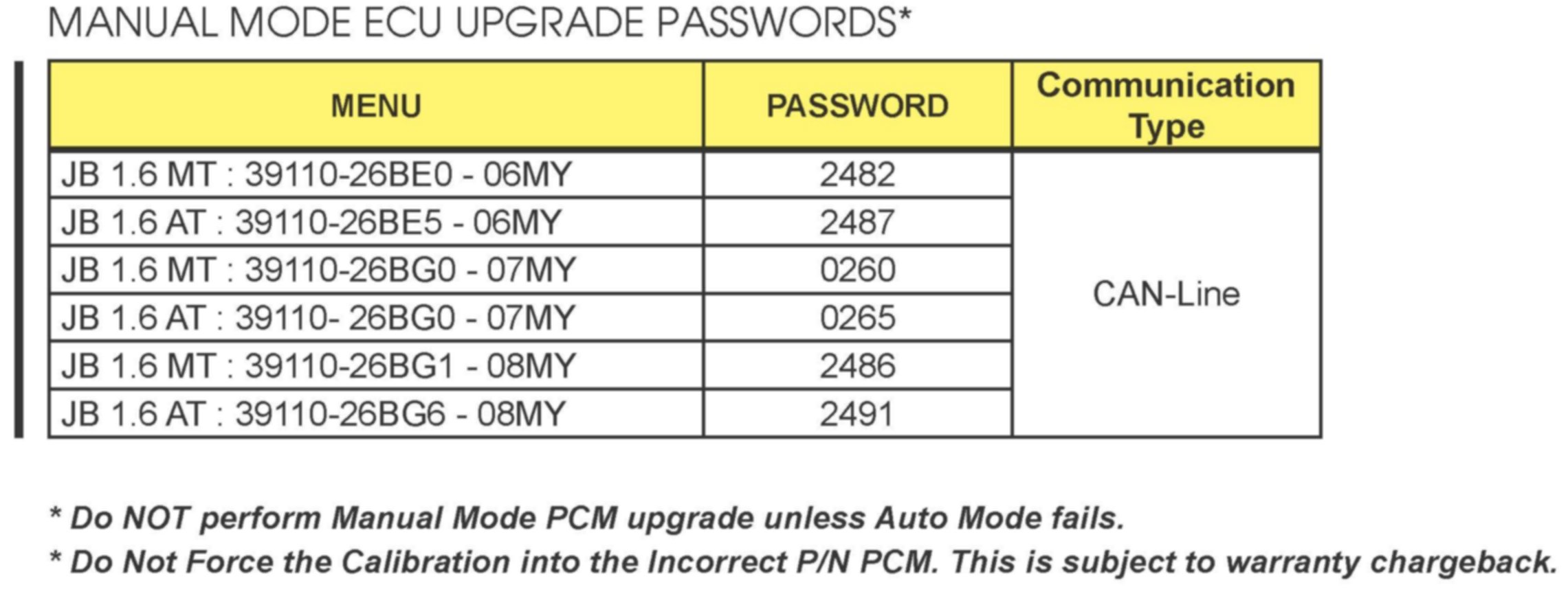 MANUAL MODE ECU UPGRADE PASSWORDS*