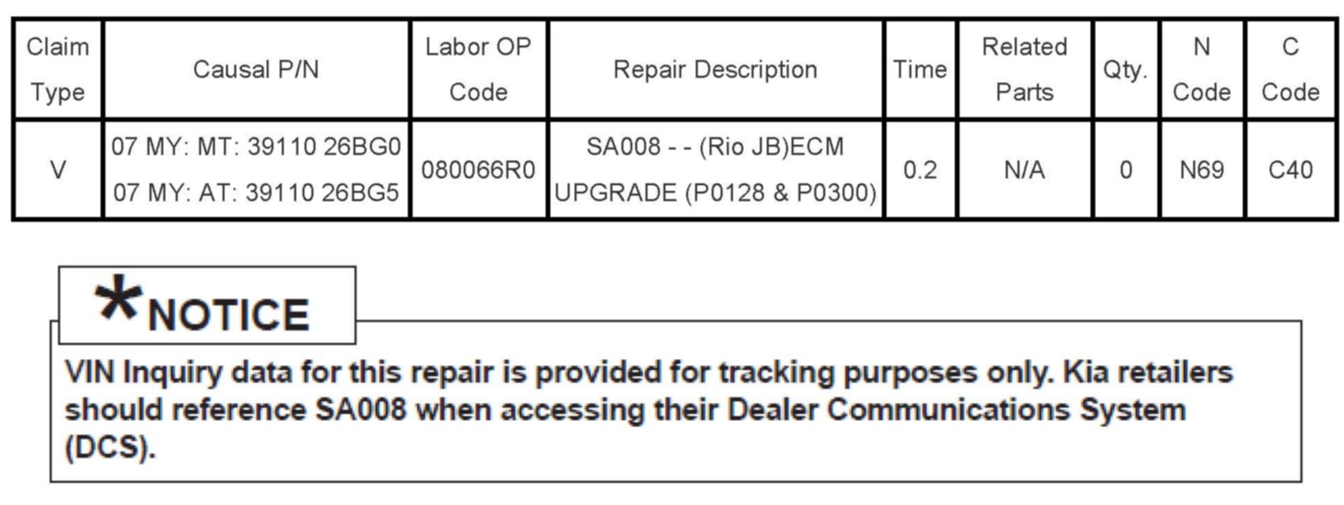 This bulletin provides the procedure to upgrade the ECM software for 2007 RIO (JB) 1.6L vehicles produced between 9/27/2006 ~ 8/25/2007, which may experience a rough idling during initial cold start-up period and illuminate the Malfunction Indicator Lamp (MIL) with the DTC P0128 or P0300.