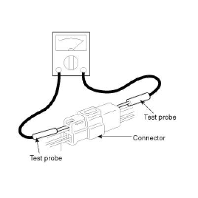 11. When using a circuit tester to check continuity or voltage on connector terminals, insert the test probe into the harness side. If the connector is a sealed connector, insert the test probe through the hole in the rubber cap until contacts the terminal, being careful not to damage the insulation of the wires.