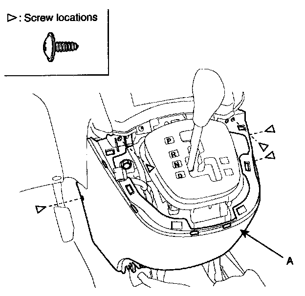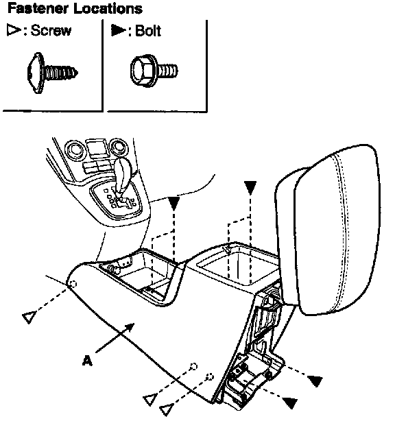 5. After loosening the console mounting screws, then remove the floor console assembly (A).