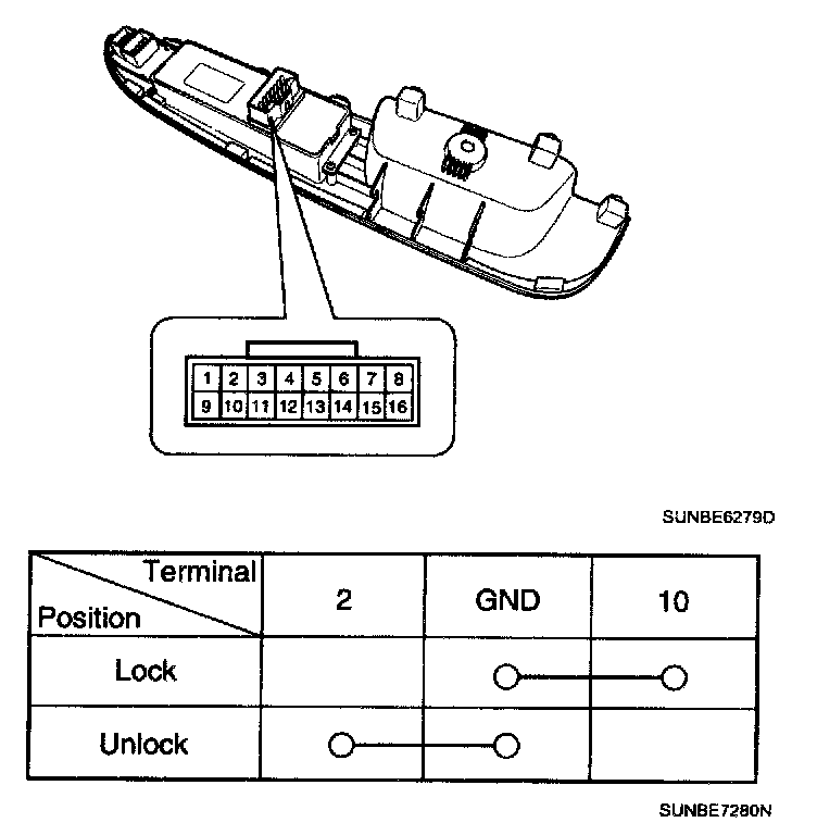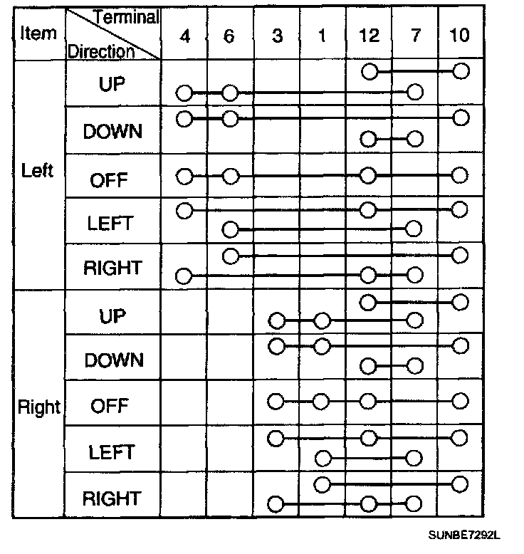 3. Check for the continuity between terminals of power door lock switch according to the table.