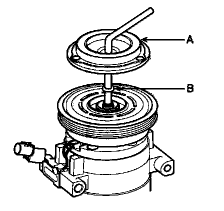 - Be careful not to damage the pulley (B) and compressor during removal/installation.