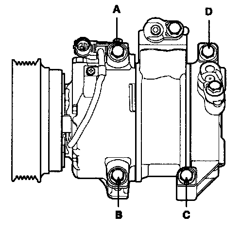 6. Disconnect the compressor clutch connector (A), and then remove 4 mounting bolts and the compressor.