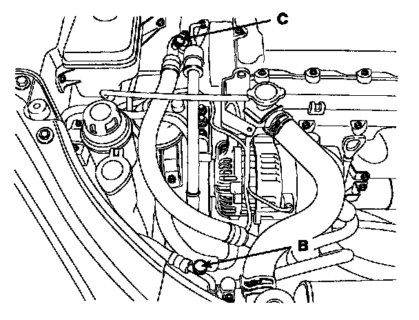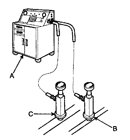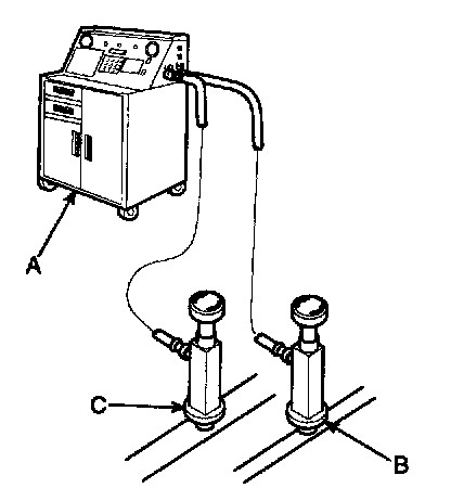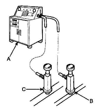 Recovery/Recycling/Charging System (A) to the high-pressure service port (B) and the low-pressure service port (C) as shown, following the equipment manufacturer's instructions.
