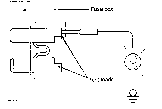 A blade type fuse test taps provided to allow checking the fuse itself without removing if from the fuse box. The fuse is good if the test lamp lights up when one lead is connected to the test taps (one at a time) and the other lead is grounded. (Turn the ignition switch so that the fuse circuit becomes operative).