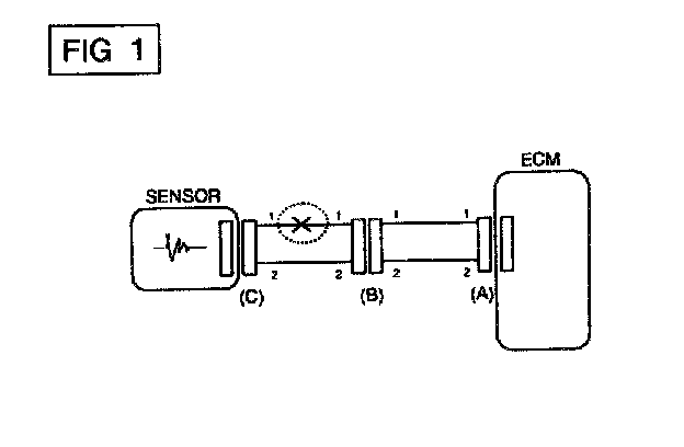 In [FIG.2.] the measured resistance of line 1 and 2 is higher than 1 Mohm and below 1 ohm respectively. Specifically the open circuit is line 1 (Line 2 is normal). To find exact break point, check sub line of line 1 as described in next step.