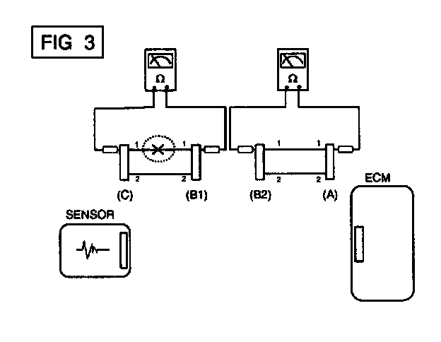 b. Disconnect connector (B), and measure for resistance between connector (C) and (B1) and between (B2) and (A) as shown in [FIG. 3].