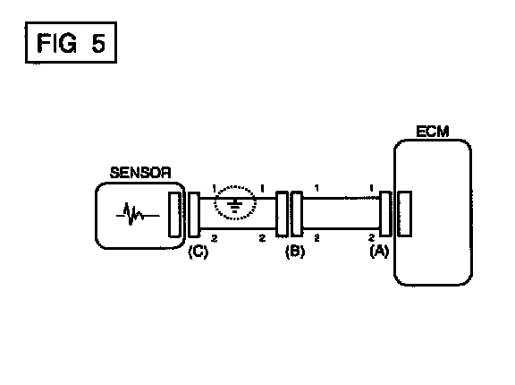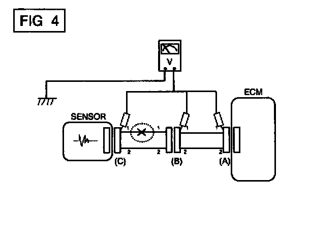 a. With each connector still connected, measure the voltage between the chassis ground and terminal 1 of each connectors (A), (B) and (C) as shown in [FIG. 4].