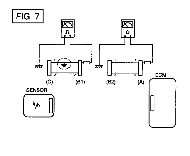 b. Disconnect connector (B), and measure the resistance between connector (A) and chassis ground, and between (B1) and chassis ground as shown in [FIG. 7].