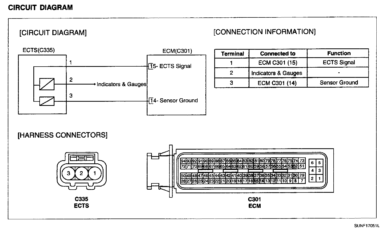 Engine Coolant Temperature Sensor (ECTS) is located in the engine coolant passage of the cylinder head for detecting the engine coolant temperature. The ECTS uses a thermistor whose resistance changes with the temperature. The electrical resistance of the ECTS decreases as the temperature increases, and increases as the temperature decreases. The reference 5 V in the ECM is supplied to the ECTS via a resistor in the ECM.That is, the resistor in the ECM and the thermistor in the ECTS are connected in series. When the resistance value of the thermistor in the ECTS changes according to the engine coolant temperature, the output voltage also changes. During cold engine operation the ECM increases the fuel injection duration and controls the ignition timing using the information