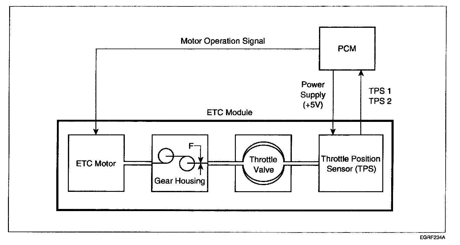 ETC (Electronic Throttle Control) system is electronically controlled throttle device which controls the throttle valve. It consists of ETC motor, throttle body and throttle position sensor (TPS). A mechanical throttle control system receives a driver's intention via a wire cable between the accelerator and the throttle valve, while this ETC system does the signal from the Accelerator Position Sensor (APS) installed on the accelerator pedal. After the PCM receives the APS signal and calculates the throttle opening angle, it activates the throttle valve by using the ETC motor. Additionally, it can materialize cruise control function without any special devices.