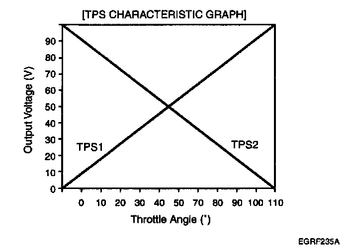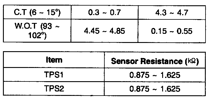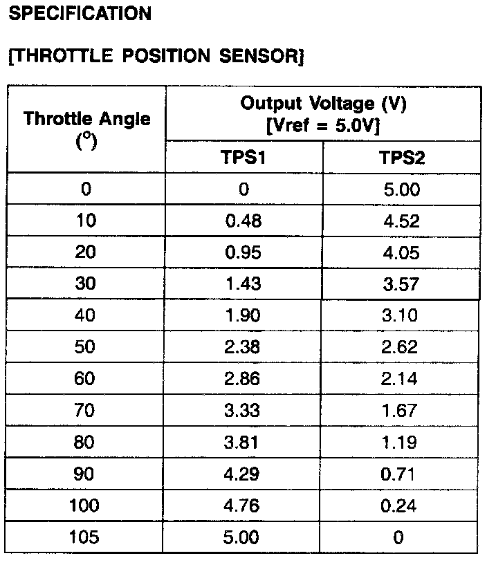 2. Start engine and check output voltages of TPS 1 and 2 at C.T and W.O.T.