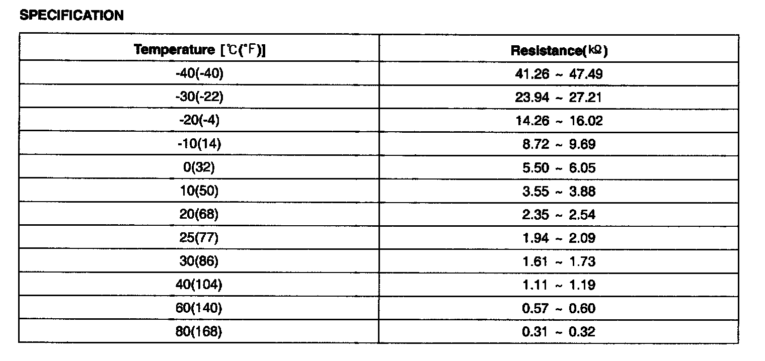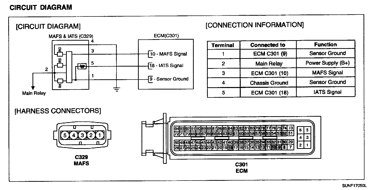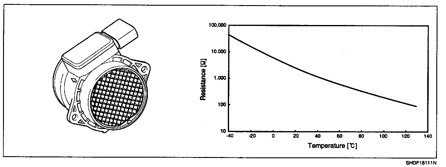Intake Air Temperature Sensor (IATS) is installed inside the Mass Air Flow Sensor (MAFS) and detects the intake air temperature. To calculate precise air quantity, correction of the air temperature is needed because air density varies according to the temperature. So the ECM uses not only MAFS signal but also IATS signal. This sensor has a Negative Temperature Coefficient (NTC) and its resistance is in inverse proportion to the temperature.