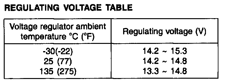 1. If the voltmeter reading agrees with the value listed in the regulating voltage table, the voltage regulator is functioning correctly. If the reading is other than the standard value, the voltage regulator or the alternator is faulty.