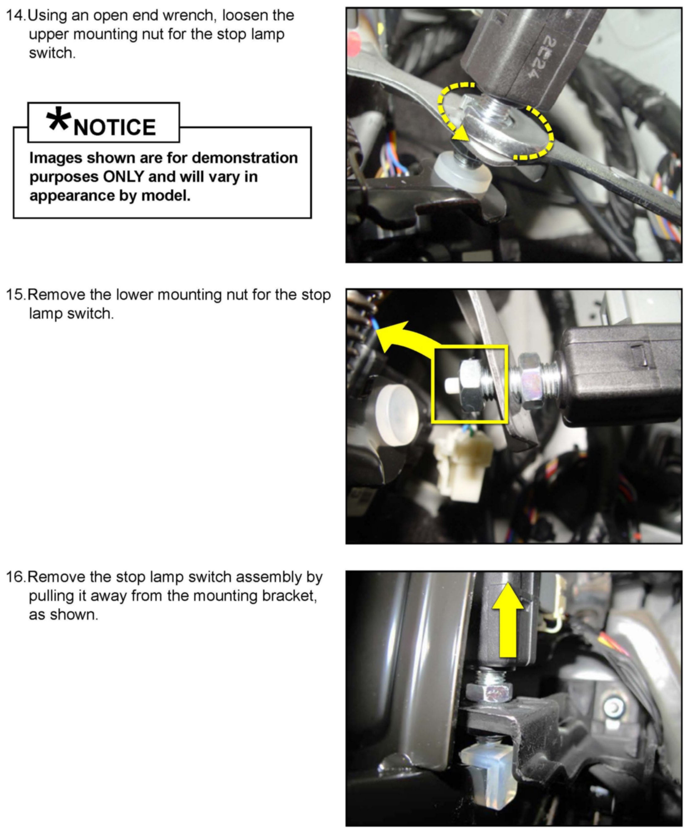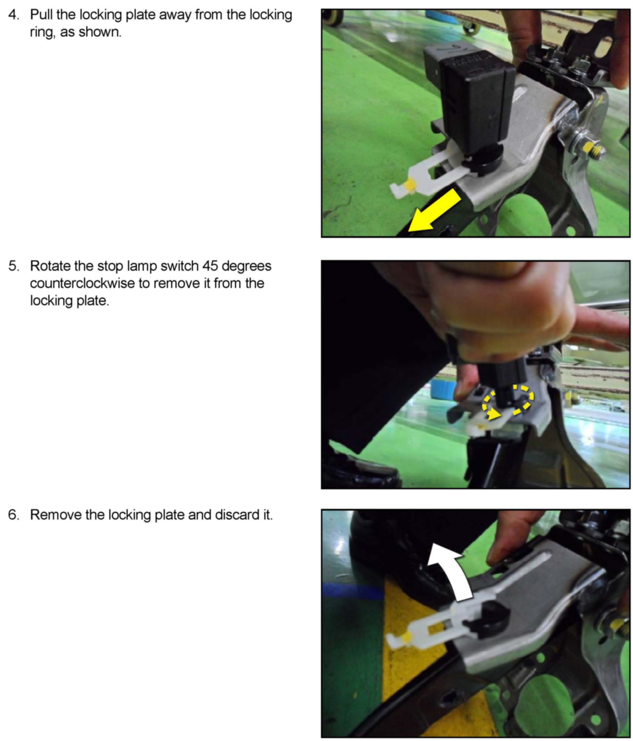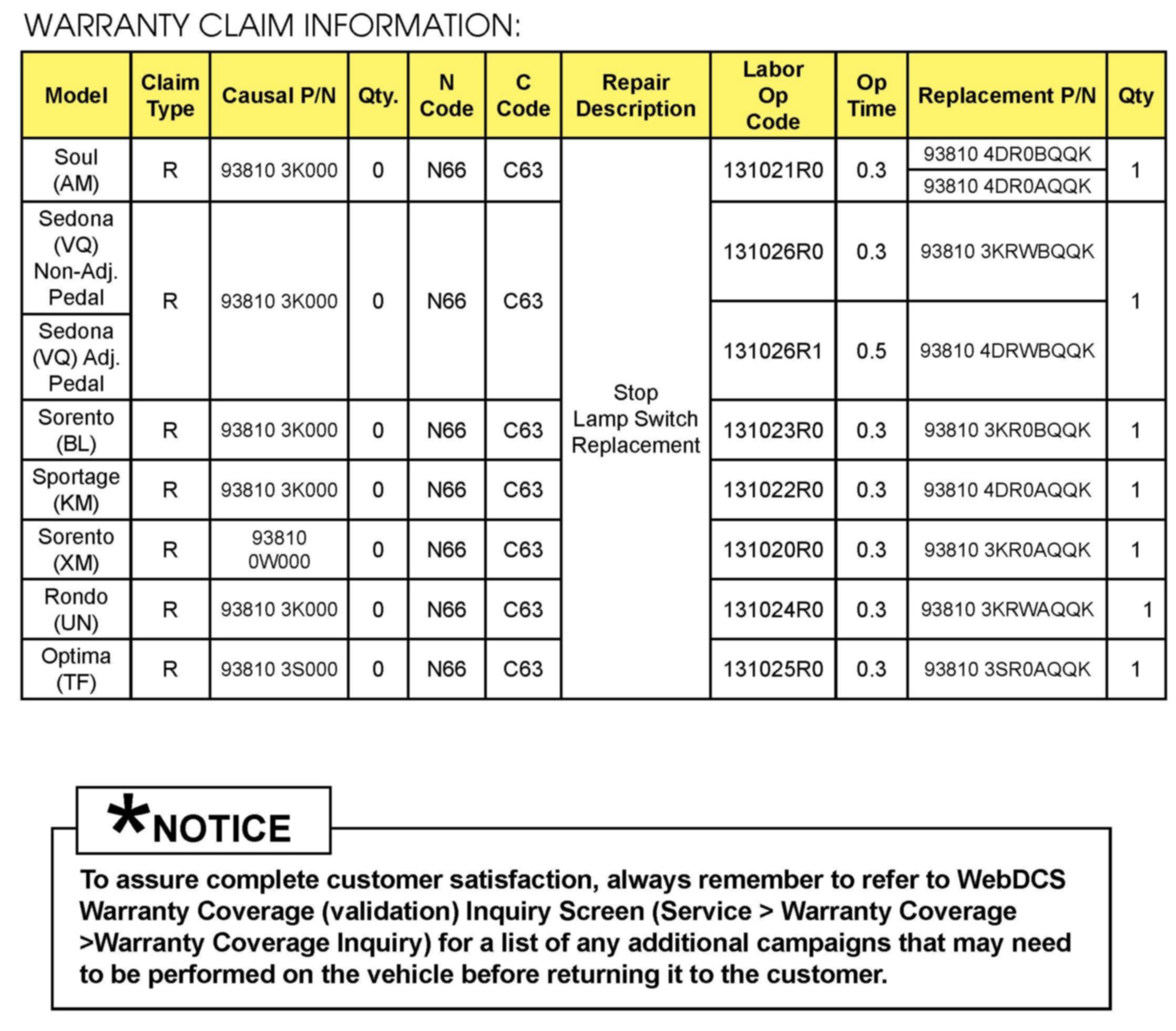 Three (3) replacement procedures using eight (8) different part numbers are covered in this Bulletin. Each procedure covers specific vehicle models and stop lamp switch parts.