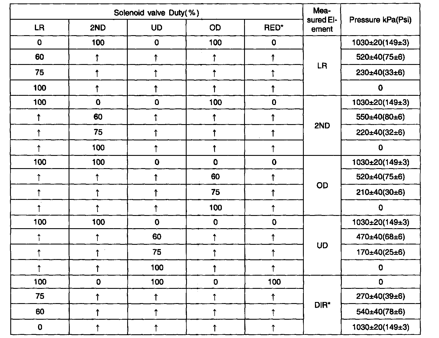 Under the constant current amount of VFS (200mA), the line pressure will become as below table. Be sure that the following data can be achieved by specific special facility or device to check the performance of A assembly (not on the vehicle), however we can refer the maximum pressure value according to each element.