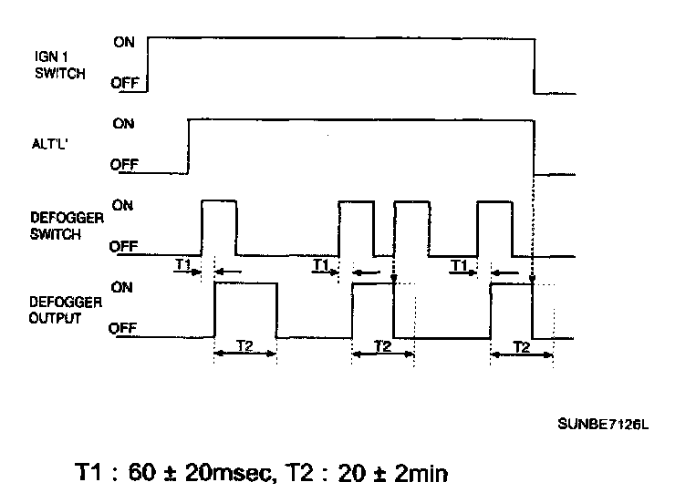 1. In state of IGN1 SWITCH ON, after ALT "L" is ON and then DEFOGGER SWITCH is ON, ON the output of DEFOGGER for 20 min.