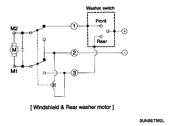 3. Connect positive (+) and negative (-) battery cables to terminals 3 and 2 respectively to see that the washer motor runs and water is pumped.