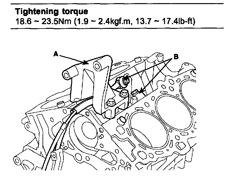 19. Install the power steering pump bracket(A) and the knock sensor(B).
