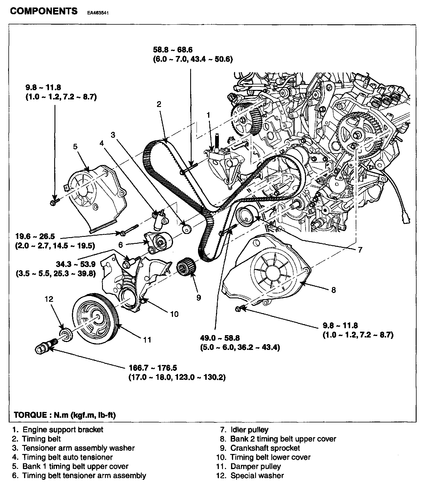 3. Replace the tensioner and the idler if grease is leaked from bearings.