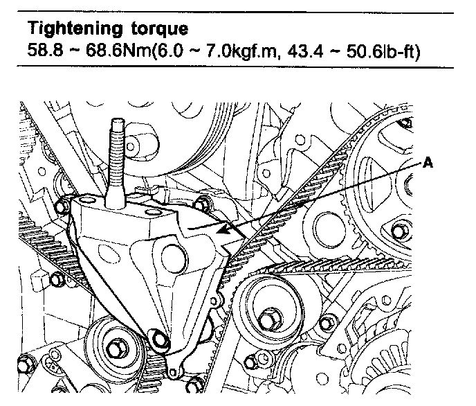 6. Align the groove of the pulley with the timing mark of the timing belt cover by turning the crankshaft pulley clockwise. Check if the timing mark of the camshaft sprocket is aligned with that of the cylinder head cover.