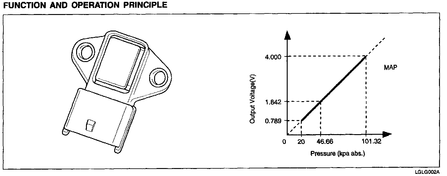 Manifold Absolute Pressure Sensor (MAPS) is speed-density type sensor and is installed on the surge tank. This MAPS senses absolute pressure in surge tank and transfers this analog signal proportional to the pressure to the PCM. The PCM calculates the intake air quantity and engine speed based on this signal. This MAPS consists of piezo-electric element and hybrid IC that amplifies the element output signal. The element is silicon diaphragm type and adapts pressure sensitive variable resistor effect of semi-conductor. 100% vacuum and the manifold pressure applies to both sides of it respectively. That is, this sensor outputs the silicon variation proportional to pressure change by voltage.