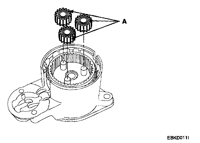 11. Disconnect the stop ring (A), overrunning clutch (B), internal gear (C) and planet shaft (D).