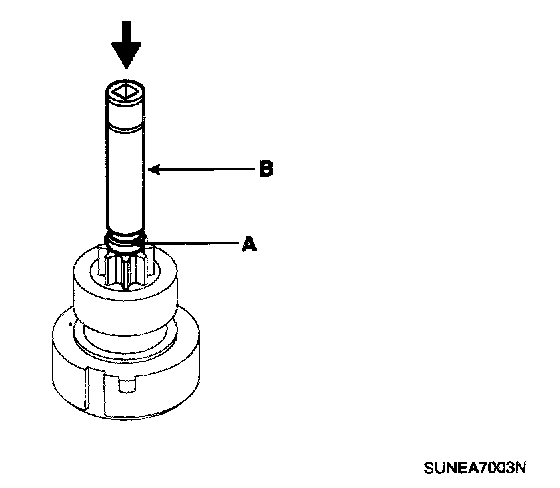 NOTE: Using a suitable pulling tool (A), pull the overrunning clutch stop ring (B) over the stopper (C).