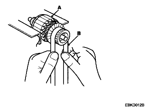 4. Check the commutator (A) surface. If the surface is dirty or burnt, resurface with emery cloth or a lathe within the following specifications, or recondition with # 500 or # 600 sandpaper (B).