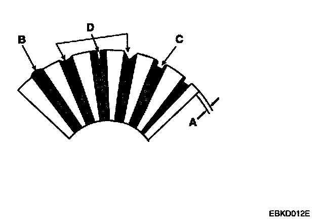 6. Check the mica depth (A). If the mica is too high (B), undercut the mica with a hacksaw blade to the proper depth. Cut away all the mica (C) between the commutator segments. The undercut should not be too shallow, too narrow, or v-shaped (D).