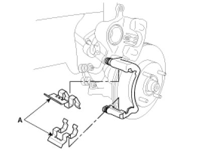 4. Push in the piston (A) so that the caliper will fit over the pads. Make sure that the piston boot is in position to prevent damaging it when pivoting the caliper down.