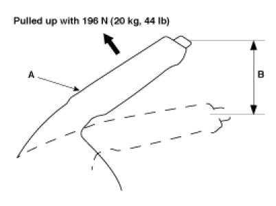 1. Pull the parking brake lever (A) with 196 N (20 kg, 44lbf) force to fully apply the parking brake. The parking brake lever should be locked within the specified number of clicks (B).