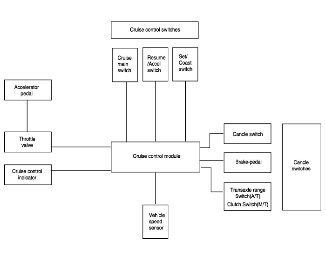 Transaxle range switch and brake switch are provided to disengage the cruise control system. The switches are on brake pedal bracket and transaxle. When the brake pedal depressed or select lever shifted, the cruise control system is electrically disengaged and the throttle is returned to the idle position.