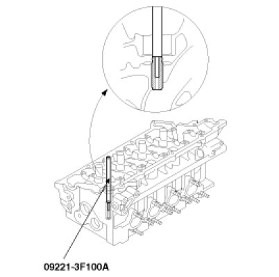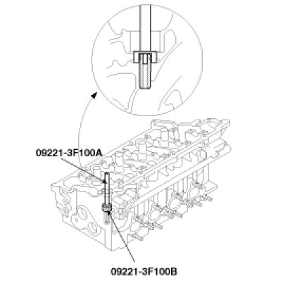 3. Using the SST (09221 - 3F100 A/B), press-fit the valve guide. The valve guide must be press-fitted from the upper side of the cylinder head. Keep in mind that the intake and exhaust valve guides are different in length.