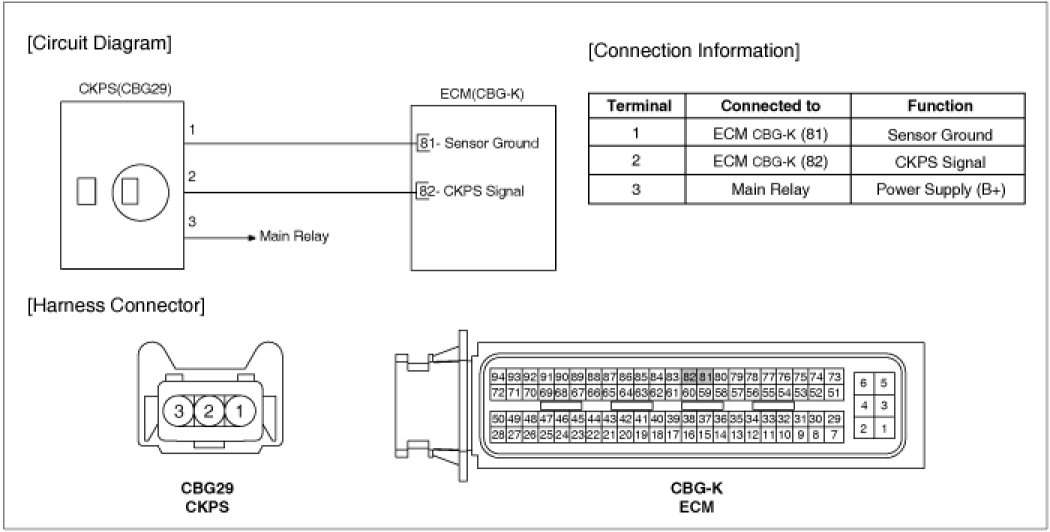 Crankshaft Position Sensor (CKPS) detects the crankshaft position and is one of the most important sensors of the engine control system. If there is no CKPS signal input, fuel is not supplied and the main relay does not operate. That is, vehicle can't run without CKPS signal. This sensor is installed on transaxle housing and generates alternating current by magnetic flux field which is made by the sensor and the target wheel when engine runs. The target wheel consists of 58 slots and 2 missing slots on 360 CA (Crank Angle).