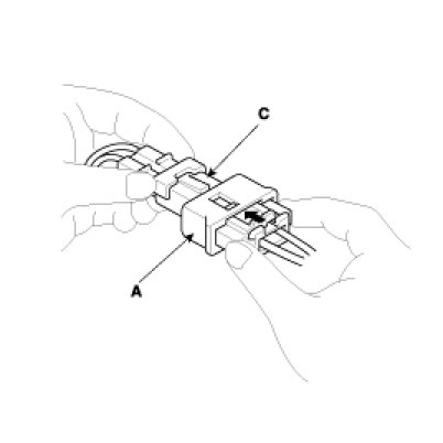 1. To reconnect, hold the pawl-side connector half, and press on the back of the sleeve-side connector half in the direction shown. As the two connector halves are pressed together, the sleeve (A) is pushed back by the pawl (C). Do not touch the sleeve.