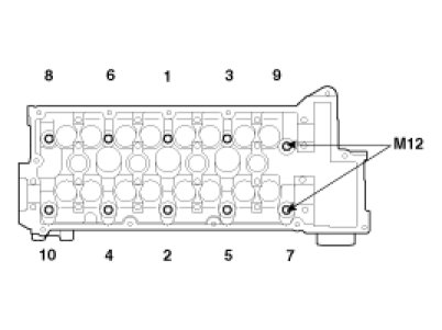 Using 8 mm and 10 mm hexagon wrench, install and tighten the 10 cylinder head bolts and plate washers, in several passes, in the sequence shown.