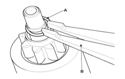 Using a suitable pulling tool (A), pull the overrunning clutch stop ring (B) over the stopper (C).
