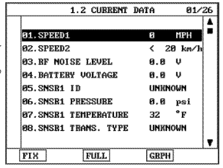 The F1 (FIX) key is used to select a data parameter after highlighting it using the up/down arrow keys. Fixing a data item forces the TPMS tool to provide updated information for Fixed items only.